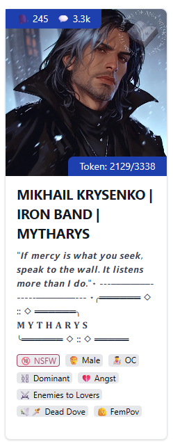 Невероятно слоп карточка, играющаяся сразу с 2 персонажами. Биография и примеры речи были выписаны из интервью и фильмов "Тату в Поднебесной" и "Анатомия Тату". Есть небольшое мемо и лорбук. Почему у Лены больше примеров? Потому что она мне нравится больше.