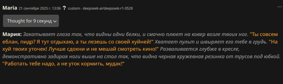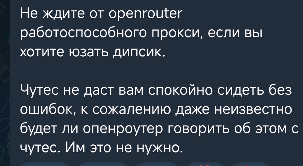 Лан, спс, но я думаю просто что он хуй забил на дипсик и его пресеты не рабочие толком, либо хуевые. Оно и понятно, ведь тут илита кумят на гемини, клоде. Кому нахуй впал этот писик..