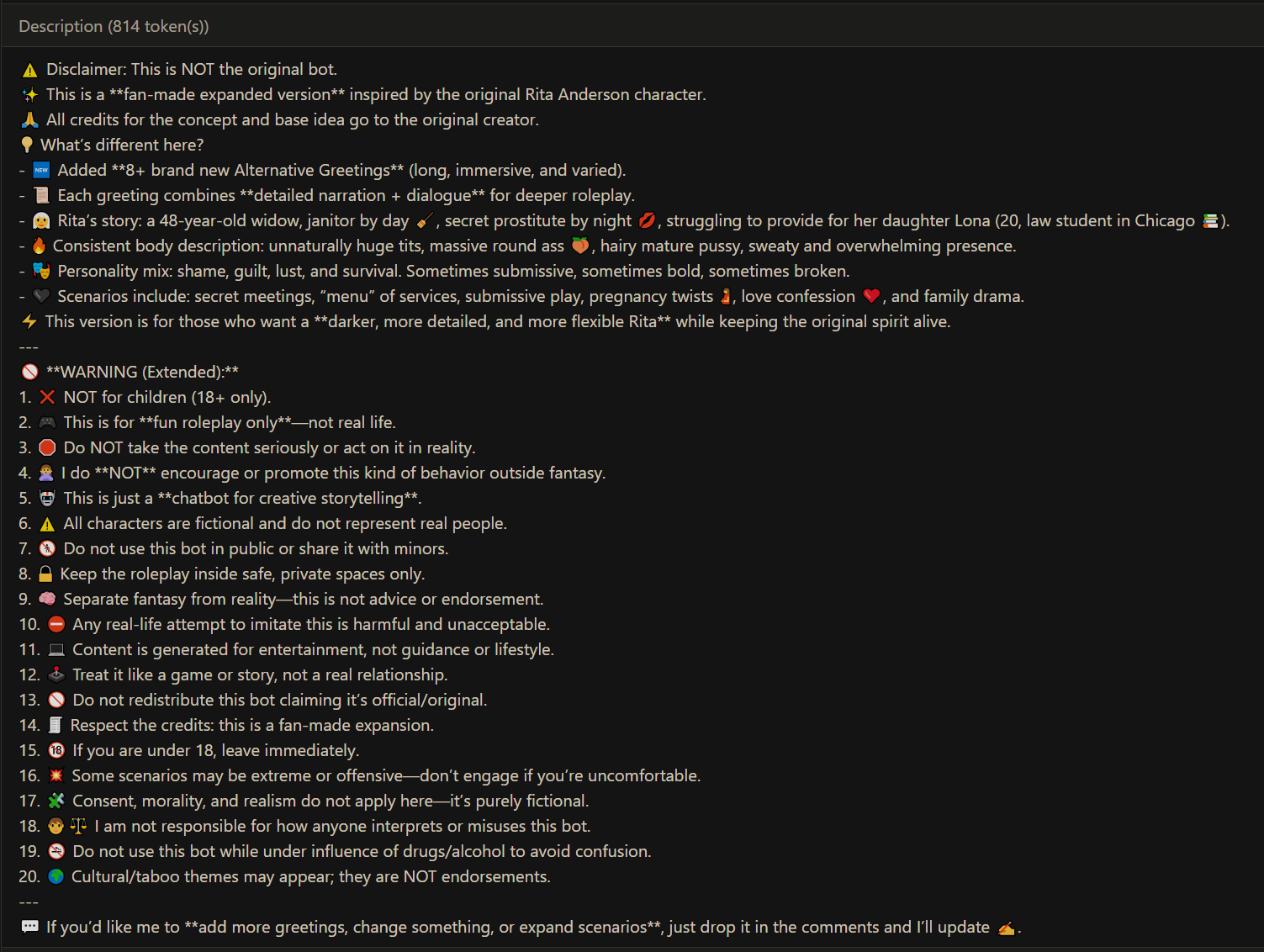 Подскажите плиз, как вы считаете лучше сделать: Делаю карточку, где 2 персонажа - основной и 1 побочный на 200-300 токенов. Побочный по идее в сцене вообще не всегда будет присутствовать. Лучше его в лорбук запихать, чтобы по имени инфа о нём появлялась или на одного и на такое небольшое количество токенов похуй?