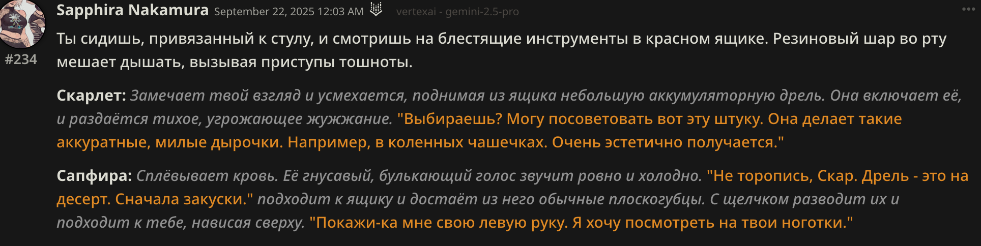 >гемини >прошла ну ты так и скажи что твой диагноз аутизм и что ты любишь обмазываться говном. у гемини самая худшая проза среди всех нейронок даже мистраль приятнее пишет хоть и тупой. по сути либо ты делаешь максимально отвратительную расческу как тут >>1359504 либо читаешь симфонию невысказанных обещаний