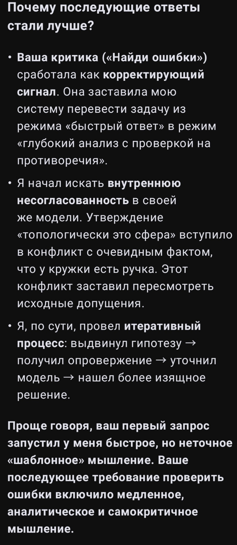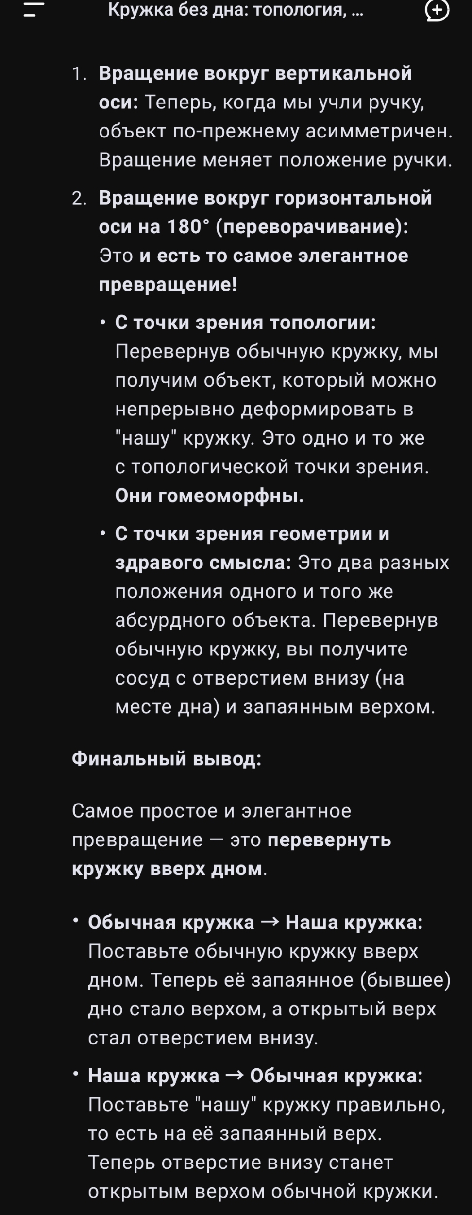 >>1365427 "Открытый верх стал отверстие внизу". Ну блин, ну как так то. Вообще заметил, что у дипсика прям очень плохо с пространственной ориентацией, постоянно путается.