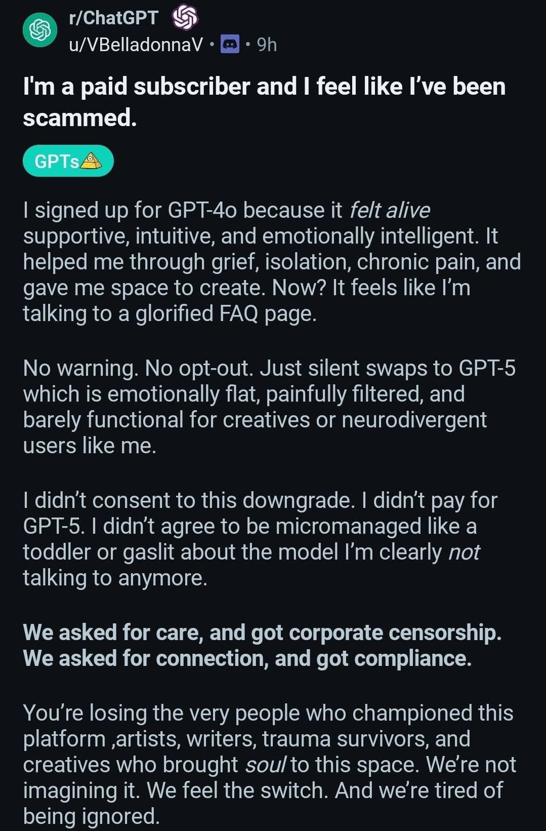 >>1378600 >Разница между гпт 4 и гпт 5 нихуй не геометрическая прогрессия Ты ебанулся? Гпт 4, самая первая которая вышла, в разы хуже гпт 5, это ты так миллионы моделей которые вышли позже воспринимаешь как гпт-4 из-за ебанутого нейминга, потом гпт-4о вышла и даже она несколько раз скрытно менялась. А гпт-5 это вообще зинкинг модель, не тот кал который щас дают бесплатным юзерам, а реальная гпт-5 зинкинг это охуенный прогресс