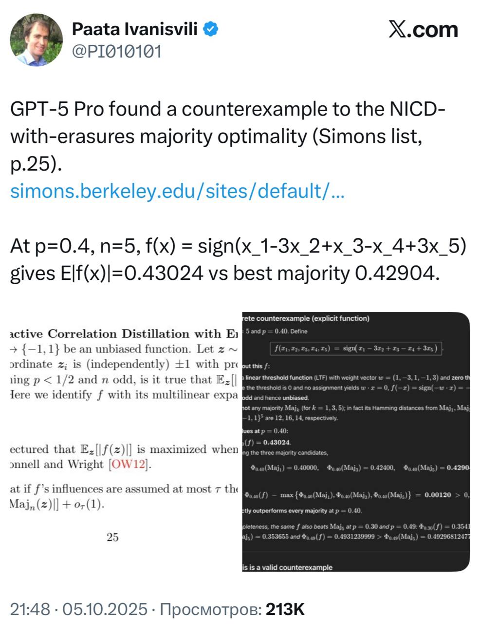 Суть тут в том, что ученые долгое время считали, что мажоритарная функция в этой задаче является оптимальной. GPT-5 впервые доказала обратное, подобрав контрпример.