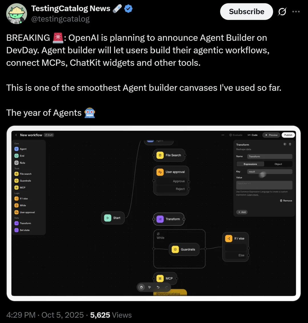 Прорывные новости! OpenAI планирует выкатить Конструктор агентов на DevDay. Конструктор агентов позволит пользователям создавать агентские рабочие процессы, подключать контекстные протоколы моделей, виджеты для чатов и другие инструменты. По отзывам это самый удобный конструктор агентов, который только был. Этот год будет годом агентов. Также OpenAI планирует добавить селектор моделей на OpenAI платформу, что может означать новую модель генерации изображений завтра.