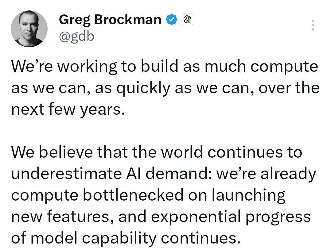 Грег Брокман: «В ближайшие несколько лет мы будем работать над тем, чтобы создать как можно больше вычислительных мощностей в кратчайшие сроки. Мы считаем, что мир по-прежнему недооценивает спрос на ИИ: мы уже сталкиваемся с вычислительными ограничениями при запуске новых функций, а возможности моделей продолжают расти в геометрической прогрессии».