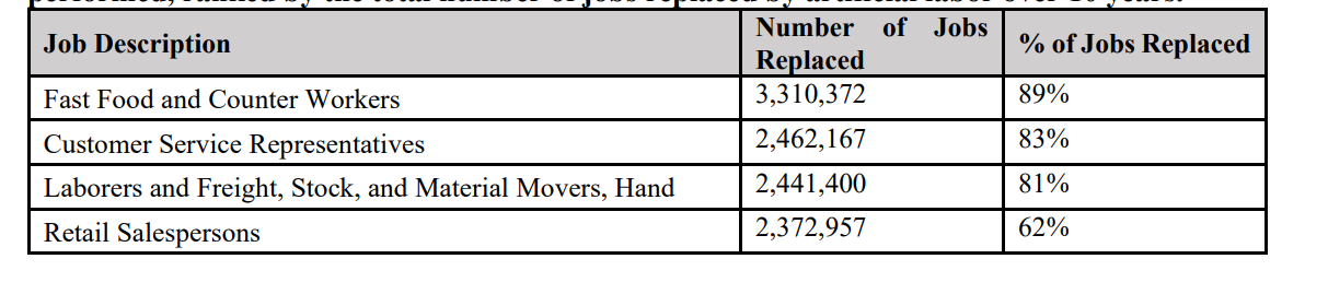 В основе новости: анализ, проведенный демократами из Сенатского комитета по здравоохранению, образованию, труду и пенсиям на основе ChatGPT, показал, что ИИ может уничтожить целые группы рабочих мест как для белых, так и для синих воротничков. В отчете содержится предупреждение о росте «искусственного труда», который, по его мнению, может «изменить экономику менее чем за десятилетие». Согласно выводам комитета, в течение следующих десяти лет могут быть заменены 89 % рабочих мест в сфере быстрого питания, 64 % должностей в сфере бухгалтерского учета и 47 % должностей в сфере грузовых перевозок. В отчете оценивается, что в этот период может быть автоматизировано почти 100 миллионов рабочих мест в США.