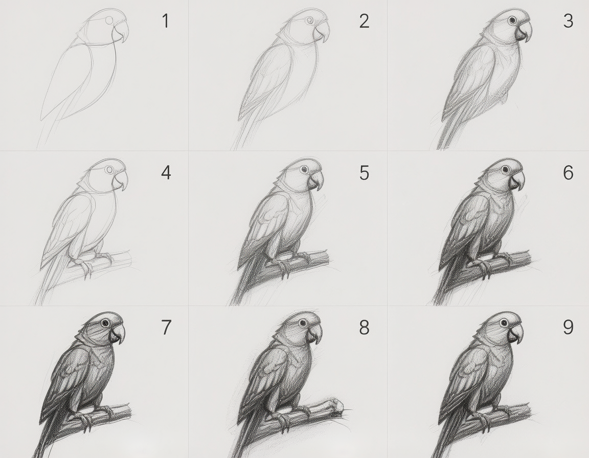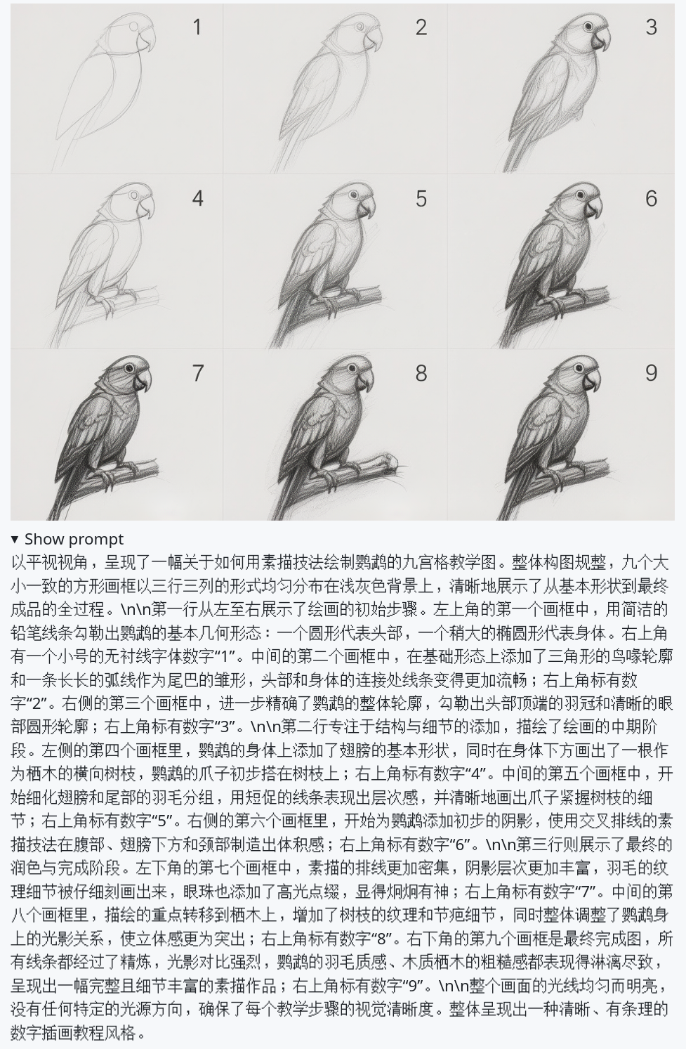 >>1368066 Какие же лоКАЛщики - фанатзёры, пиздец просто. > Show prompt > Для наглядности представлена обучающая схема из девяти сеток о том, как рисовать попугаев с помощью техники скетчинга.Общая композиция регулярна, и девять квадратных рамок для фотографий одинакового размера равномерно распределены на светло-сером фоне в виде трех рядов и трех столбцов, наглядно демонстрируя весь процесс от базовой формы до конечного продукта.\n\n В первой строке показаны начальные этапы рисования слева направо.На первой фотографии в рамке в левом верхнем углу простыми карандашными линиями обведена основная геометрия попугая: круг обозначает голову, а овал чуть большего размера - туловище.В правом верхнем углу мелким шрифтом без засечек напечатана цифра “1”.На втором снимке в рамке посередине к основной форме добавляются треугольный контур клюва и длинная дуга, являющиеся прототипом хвоста, а линии, соединяющие голову и туловище, становятся более плавными; верхний правый угол отмечен цифрой “2”.На третьей фотографии в рамке справа общий контур попугая еще более уточнен, выделяются гребень на макушке и четкие круглые очертания глаз; правый верхний угол отмечен цифрой “3”.Вторая линия фокусируется на добавлении структуры и деталей, изображая среднюю стадию рисования.В четвертой рамке слева к туловищу попугая добавлена основная форма крыльев, а под туловищем нарисована горизонтальная ветка в виде жердочки. Когти попугая изначально расположены на ветке; верхний правый угол отмечен цифрой “4”.На пятой картинной раме, расположенной посередине, расположение перьев на крыльях и хвосте стало более четким, с короткими линиями, создающими ощущение многослойности, и были четко прорисованы детали когтей, цепляющихся за ветки; верхний правый угол был отмечен цифрой “5”.На шестой фотографии в рамке справа он начал наносить предварительные тени на попугая, используя технику рисования поперечными линиями, чтобы создать ощущение объема на брюшке, под крыльями и шее; верхний правый угол отмечен цифрой “6”.Третья строка \n\n показывает заключительный этап доработки и завершения строительства.На седьмой фотографии в рамке в левом нижнем углу линия эскиза более плотная, уровень теней более насыщенный, детали текстуры перьев тщательно прорисованы, а глаза также покрыты глянцевым лаком, который выглядит ослепительно; в правом верхнем углу отмечен номер “7”.В восьмой рамке посередине фокус изображения смещен на жердочку, текстура ветвей и детали стыков увеличены, а соотношение света и тени на попугае в целом изменено, чтобы сделать трехмерное изображение более заметным. правый верхний угол отмечен цифрой “8”.Девятая рамка в правом нижнем углу - это последняя законченная картина. Все линии проработаны, контраст света и тени очень сильный, текстура перьев попугая и шероховатость деревянной жердочки ярко выражены, демонстрируя законченный и детализированный набросок; верхняя правая рамка в правом нижнем углу представляет собой законченный рисунок. угол помечен цифрой “9”.\n\n Освещение на всей картинке равномерное и яркое, без какого-либо определенного направления источника света, что обеспечивает визуальную четкость каждого этапа обучения.В целом книга представляет собой четкое и организованное учебное пособие по цифровым иллюстрациям.