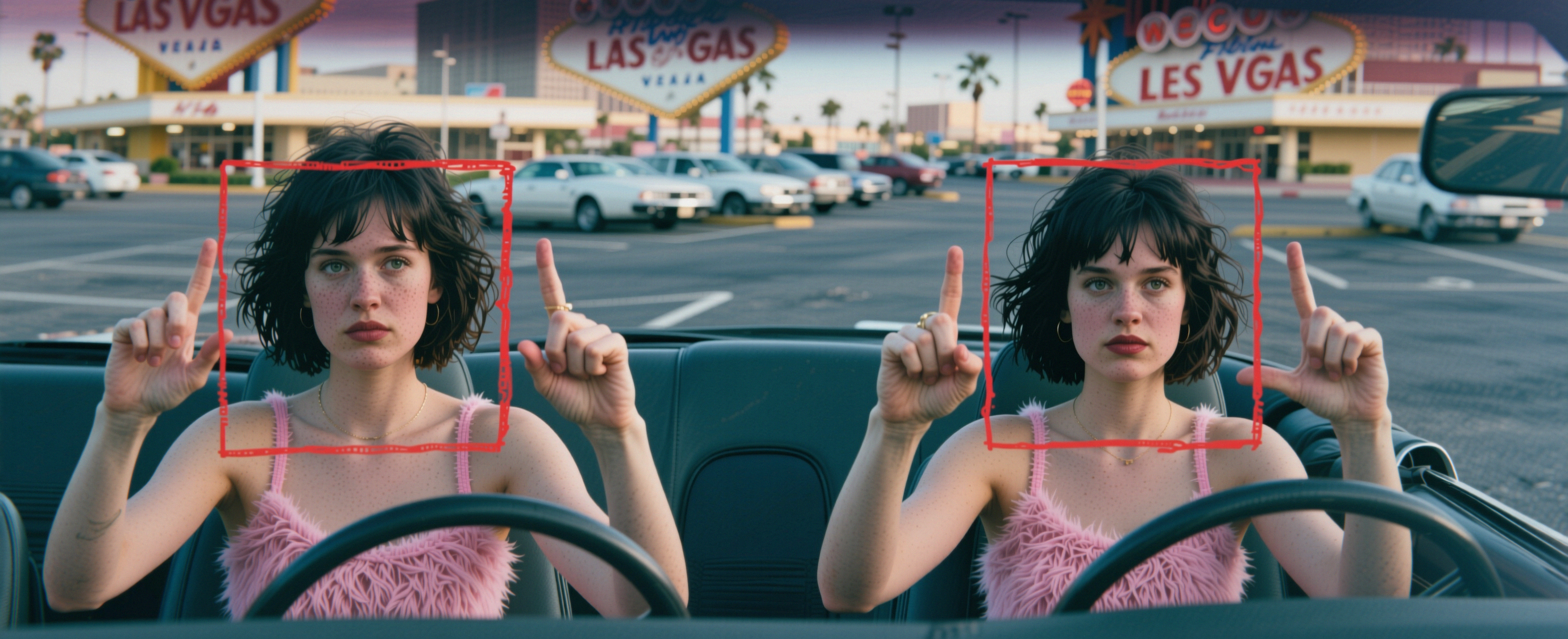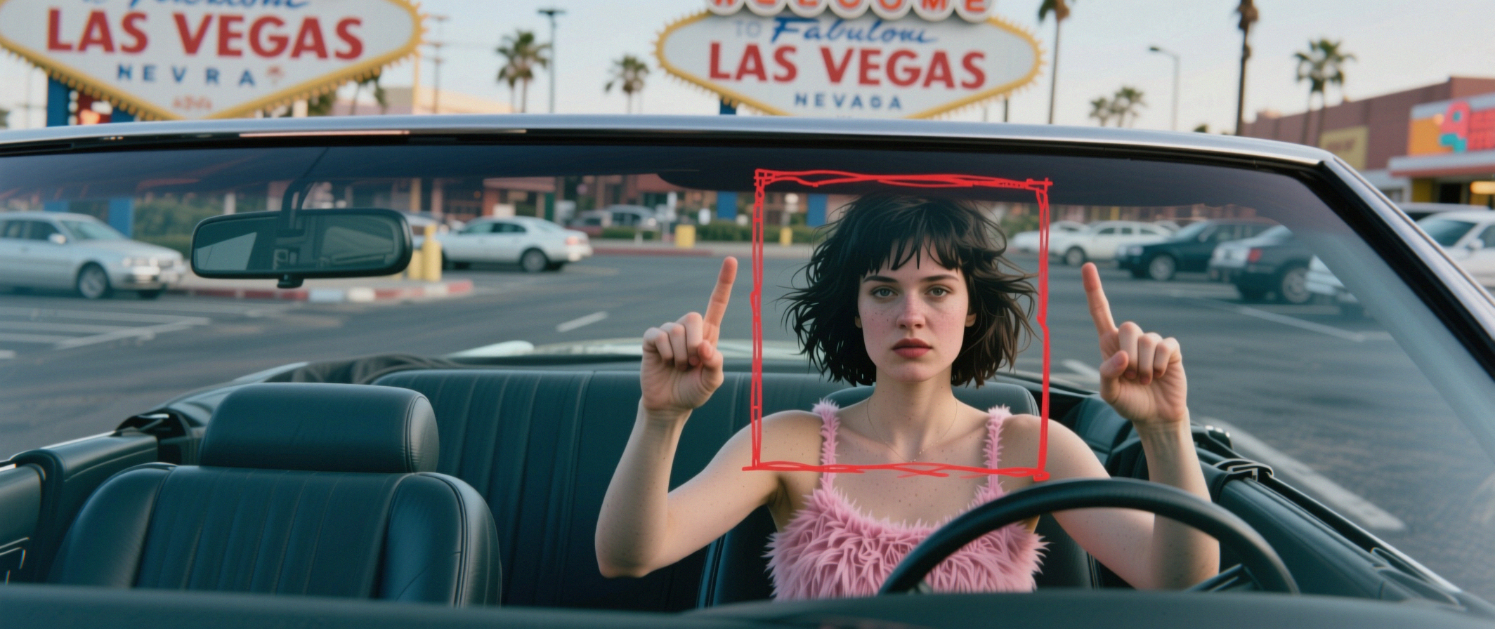 a young woman in a pink fur tank top and with short dark messy hair sitting at the wheel of a convertible coupe, she is drawing a square in the air with her fingers with both hands, a thin red square is overlaid over the picture implying that is where she drawn the imaginary square, the scene takes place on a parking lot in front of casino in Las Vegas