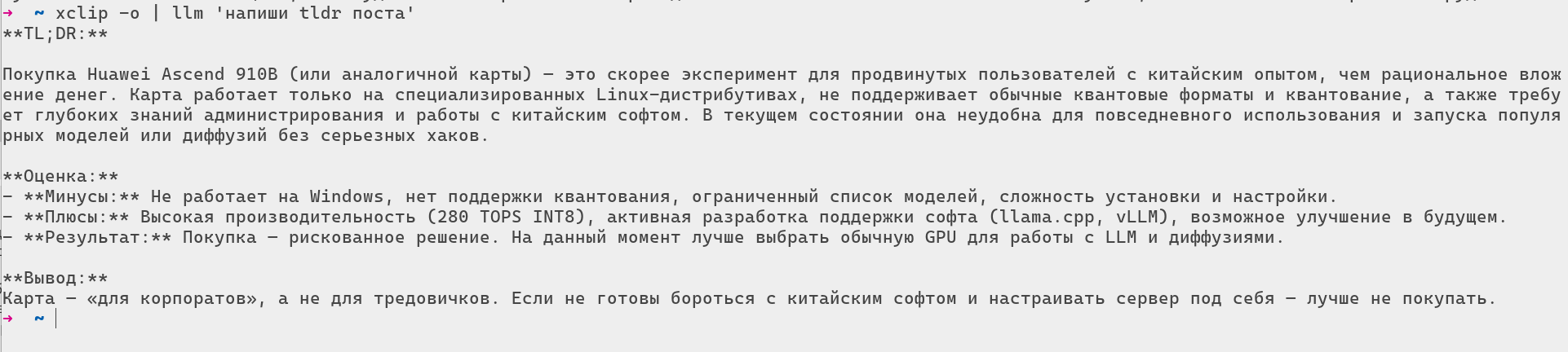Сей поток словестного поноса будет направлен на выводы по карточке, которую я с дуру купил за 136к рублей, когда повёлся на хайповые заголовки. Я сразу скажу, что я не думал перед покупкой, при покупке, да и после покупки у меня достаточно пустая голова, однако я сейчас поделюсь с вами информацией(а так же некоторыми цифрами), что эта карта могёт. Данный пост так же будет продублирован в SD тред, т.к. диффузии на карте тоже запускались и в LLM тред, т.к. языковые тоже, это общий вывод по железке. Для начала стоит сказать, что я нашёл людей, для которых создана эта карта, вам понадобится: купить сервер Kungpeng 200 на арм чипах 910, купить 4 таких карты что бы забить все слоты в райзерах. Суммарно на это у вас уйдёт около 1.5 миллиона рублей, быть житель материковый китай нефритовый стержень удар, что бы качать без заёбов себе драйвера, тулкиты, пакеты для деплоя, квантов и прочего, кроме того вам нужно иметь прямые руки, понимать в администрировании, девопсе и по хорошему говорить на китайском языке уверенно, что бы читать форумы Ascend. Для меня, пропитого эникея работа с картой была задачей со звёздочкой, хотя большую часть времени я вообще не то, что должен был. Если хотя бы по одному из пунктов вы проскакиваете, то вам не стоит покупать данную карту, ибо она сделана корпоратами для корпоратов, её тыкают в сервера умного видеонаблюдения, для ML(она умеет например в YOLOVv8 в 100фпс) и прочего. Теперь все подводные камни для тредовичков: 1)Не работает на винде. Вообще, даже WSL нет смысла пытаться, поддерживается на полутора дестрибутивах, ну хотя бы есть привычная ебунта LTS в списках, остальное это всякие эйлеры, кайлины, хуйлуны и пр. 2)Не поддерживает квантование. В теории оно умеет специальные кванты разработанные Ascend, на практике можно про это забыть, поддержка квантования сейчас крайне ограничена. Даже привычных легаси форматов типа Q4_0 нет. ТОЛЬКО FP16(BF16 тоже нет) 3)Поддерживает полторы модели. На данный момент поддерживает хуй да нихуя моделей, мало того почти все модели на которые хуавей говорит 100% будет работать - это 0.6-8В лоботомиты квена, даже ~80B квены старые и новые хуй. На практике чуть-чуть иначе, но всё ещё не сильно хорошо. Про запуск шизотюнов можете забыть. 4)Достать софт - боль моя дырка задница. Сразу покупайте виртуалку с пекинским айпи или запрягайте вашего продавца предоставить вам ваш необходимый для работы с картой софт, я выбрал второе. 5)Разумеется как проф карта она идёт без активного охлада и переходников для запуска на обычной пеке. Плюсы есть? Ну в теории есть, я даже выделил парочку: 1)Несмотря на то, что это по сути легаси говно 2022-го года выпуска на неё активно выпускают софт и обновления для поддержки. Буквально пол года назад я бы вообще нихуя не смог запустить на ней, сейчас есть хоть что-то. Учитывая. что рантайм для инференса MindIE от хуавея обновляется каждые 2-3 месяца(в этом месяце тоже должно выйти большое обновление), то через 3-6 месяцев этот пост вполне может перестать быть актуальным и появится значительная поддержка всего и вся под эту карту. Кроме того поддержку этой карты сейчас активно разрабатывают и развивают в llama.cpp, vLLM и прочих бекендах. Я успел пообщаться с разработчиком поддержки Ascend npu в llama.cpp, новости пока что удручающие, но работа кипит. 2)Пока что по сырым характеристикам эта карта ебёт всех своих конкурентов. 280 TOPS INT8, 96Гб памяти с 4