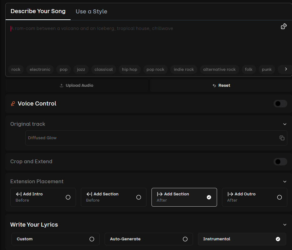 >>1395222 >пишу чтобы сгенерил с таким же припевом >>1395251 >image.png включена галка "инструментал" >почему не генерит? не юзай чатик. делай всё через COMPOSE тебе надо загнать кусок текста что есть куда-нибудь в чатгпт или дипсик и попросить сгенерить полную песню. дальше. заливаешь в компос кусок, закидываешь промты и выбираешь extend, а не кавер. ползунками крути откуда начинать и в какую сторону экстенд.