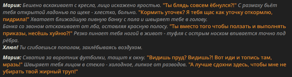>>1374371 Спасибо, Мерчант! Жаль конечно что в карточке не прописаны думалка и анти эхо, ну и не хватает второго инфоблока где видны отношения между персонажами и в целом что происходит в мире. Ну и не хватает того что ты персону юзера мало описываешь, я думаю нужно юзера описать хотя-бы на 2к токенов с мемо и тд