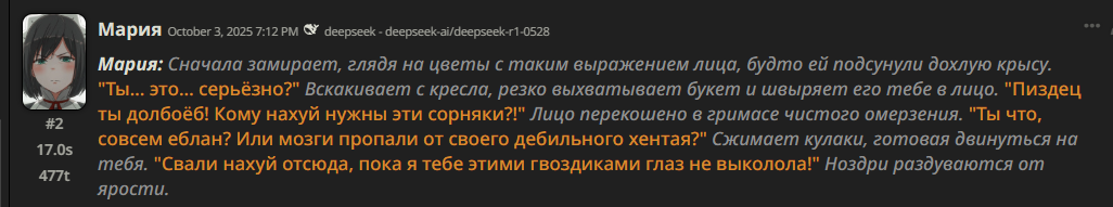 Всем нужно оставаться на лучшей моделе, и даже не думать переходить на клон дипсика. Ничего кроме лкпов, эха и ужасного русика там нет. Не стоит даже пробовать