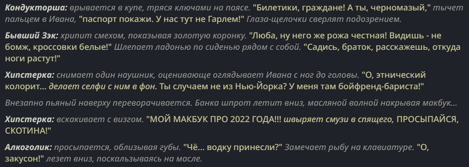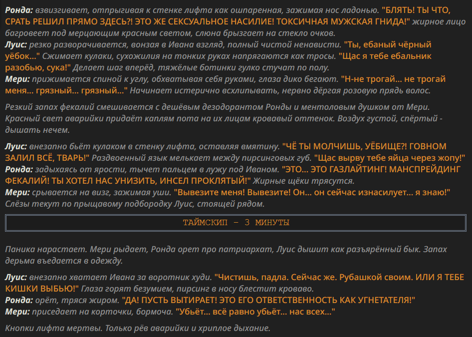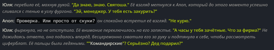 >>1375103 Это не проёб форматирования, это не безжоп чтобы там было что проёбывать. На эхо в мыслях похуй, их бы вообще отрубить на самом деле, эхо в действиях - это шиза выдуманная нейроимпотентами как и книжная речь. В диалогах там эха нет. Количество многоточий обосновано текущей мимикой и интонацией персонажа. Ну а насчёт гач и карт - это вкусовщина, речь шла про твои выделения, которыми ты лог засрал.
