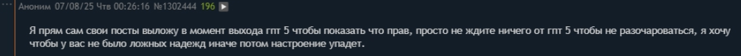 Вообще, я бы уже начал задумываться о том, чтобы уйти с Gemini. Осталось 2–3 месяца до выхода Gemini 3, и на ней будет практически невозможно нормально заниматься ролевыми играми, упор будет сделан на программирование и бенчмарки, из-за чего модель станет перегруженной и слишком зацикленной на этих задачах. Это похоже на то, как у GPT были перегибы с внутренними инструкциями. К тому же вместе с новой версией появится и новый фильтр. Размер модели, кстати, планируют уменьшить, ситуация будет похожа на GPT-5, где все ресурсы направили на рассуждения и оптимизацию скоростей. В целом, всё это довольно печально. Не хотел об этом говорить, но приходится, потому что пока не вижу ничего хорошего в будущем у Gemini.
