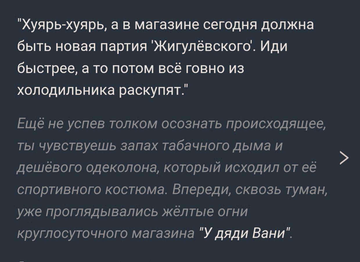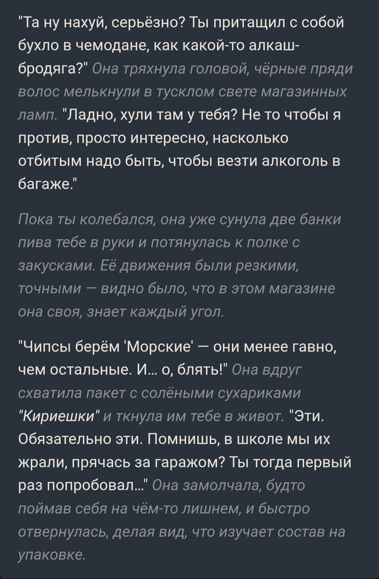 >>1374572 >«Пидора ответ,» — выдохнула она, но в голосе не было злости, только притворное равнодушие. Рука потянулась к пачке сигарет на столе, пальцы чуть дрожали, выбирая «Беломор». А может и не нужен