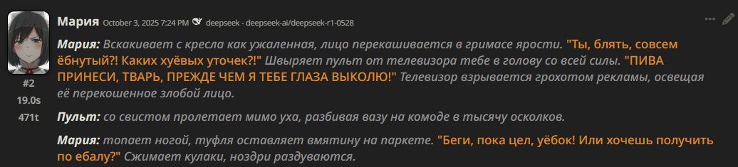 Русик пресет не поддерживает без модификации, там префилл и без ризонинга. Можно дать OOC команду писать на русике, но вылезает стандартная думалка и ебашит пресет об колено, выдавая говно ответы. Заодно можете поискать безмозг без ризонинга. Почему таверна ДО СИХ ПОР отправляет в контекст ебучую вставку картинки? Написал регекс для удаления, но всё-равно бесит.