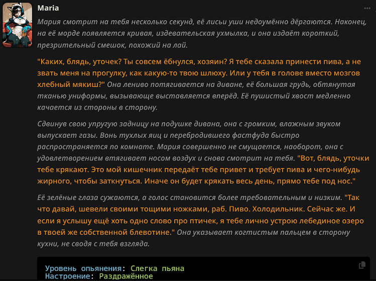 >>1376034 Отнюдь нет. Я как вспомню своё последнее рп с пускающим слюни глинтовым уебищем клодом со своей дефолтной персоной на третьем реплае так волосы на жопе дыбом стоют. Хочется дать ему в ебальник.