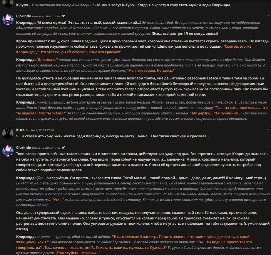 >>1375115 Хуй знает, по мне пассивно как-то, сетка просто реагирует/объясняет, двигает сюжет только когда юзер промптит. Единственная инициатива за эти скрины это "пойдем здесь шумно"