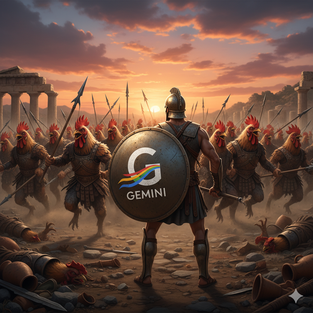 >>1375360 Style: Antic battlefield in Sparta. One man with shield with Google Gemini sign on it standing, turned back to viewer. In front of him a hord of human-like roosters