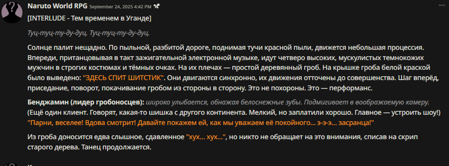 >>1374111 Я вообще хз, как люди рпшат с карточками персов. Уже давно перешёл на рпг карточки, или карточки со сценариями, вписывая персонажей походу сюжета или из лорбука.