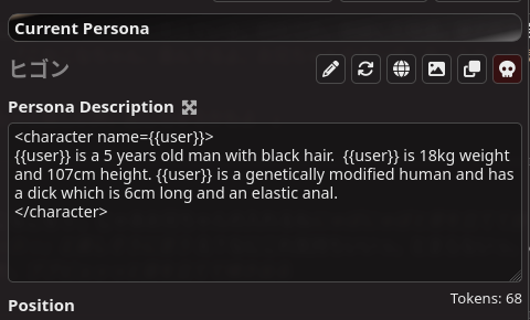 >>1376408 [char is char] [char is users mom] [infoblock в карточке на 10к токенов] [Описание юзера в карточке на 20к токенов] [пресет в карточке на 15к токенов] [Лорбук на 30к токенов с описанием зелья из озона]