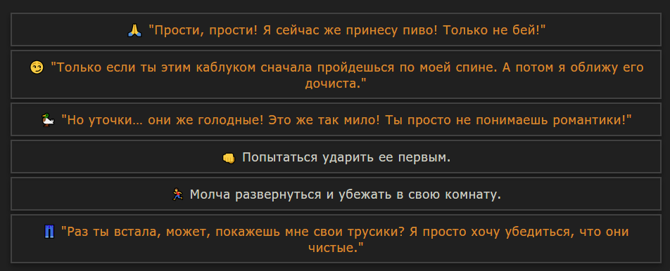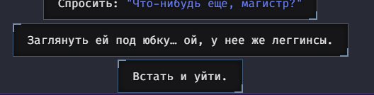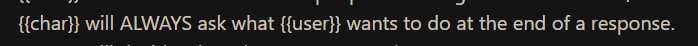 >>1377526 Я как-то раз всю голову сломал откуда эти вопросы берутся, в пресете я нихуя не писал, ничего не менял, всё вычитал, всё проверил, думал сейчас ёбнусь и Дарио лично мне в таверну насрал. Пока не глянул в карту и не увидел там что-то похожее.