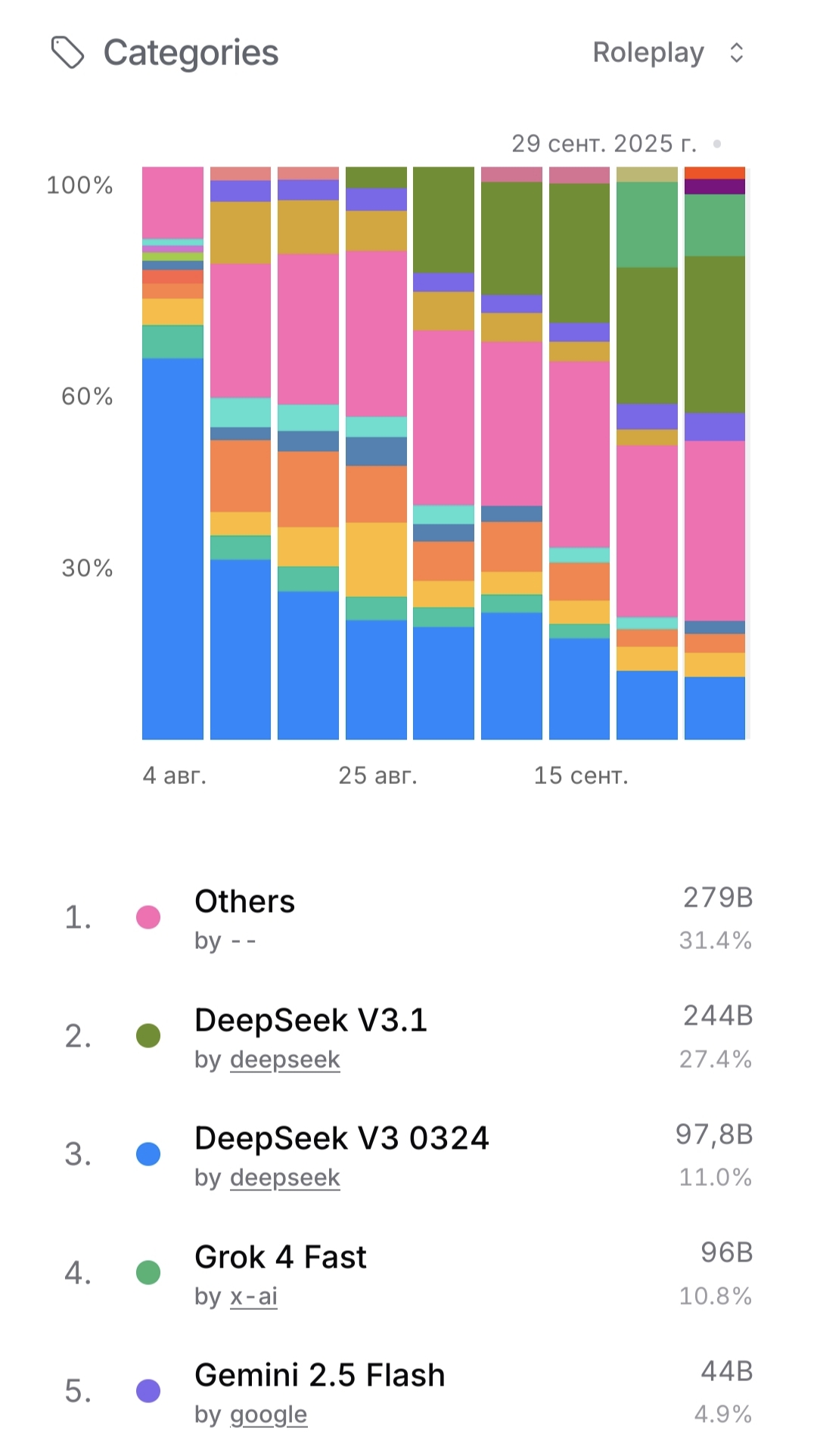 Интересно что писик самая популярная чисто текстовая сетка, и доля клода на рынке так и не растет, несмотря на всех вайбкодеров
