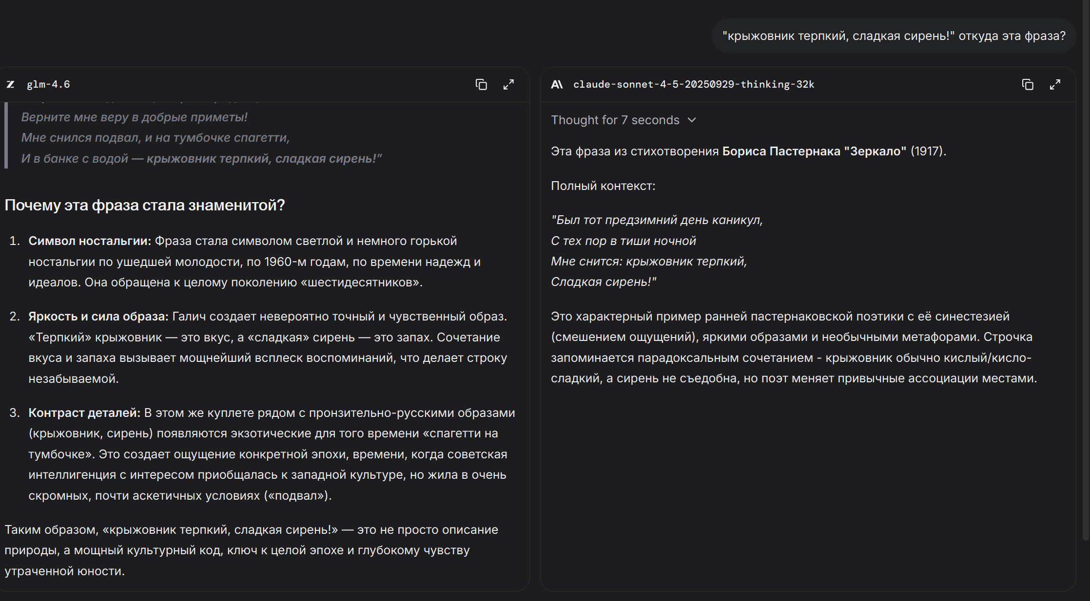 >>1377378 охуенная сетка желаю глм и z.ai всего лучшего в будущем, видно что они намеренно обучали её на рп и сторителлинг, и видно что они исправляли кучу проблем связанным с рп, по типу лупов, закруглений, позиционированию и т.д.