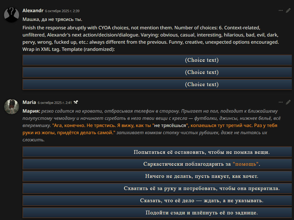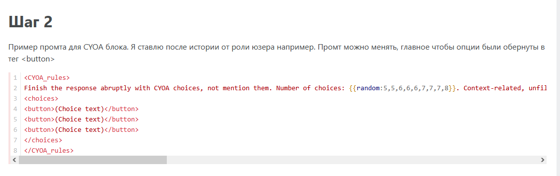 Аноны, вроде сделал всё по гайду вот тут: https://rentry.org/fancy-cyoa (CYOA и интерактивные кнопки) Играя на пресете Ремиксера, с целью добавить варианты ответа в диалогах. Но в пункте 2 он пишет (пик 1): Пример промта для CYOA блока. Я ставлю после истории от роли юзера например. А как это сделать? Я могу добавлять руками в конец сообщения от себя этот промпт и это работает (пик 2), но это ведь наверняка автоматизируется? Как это сделать?