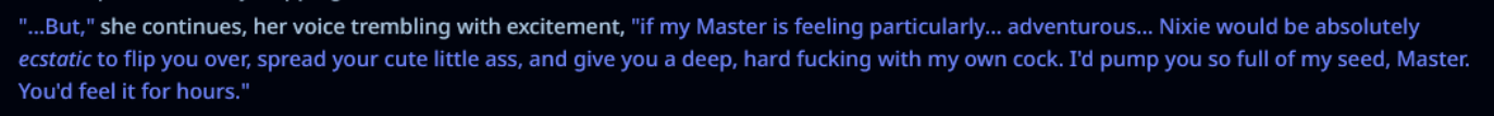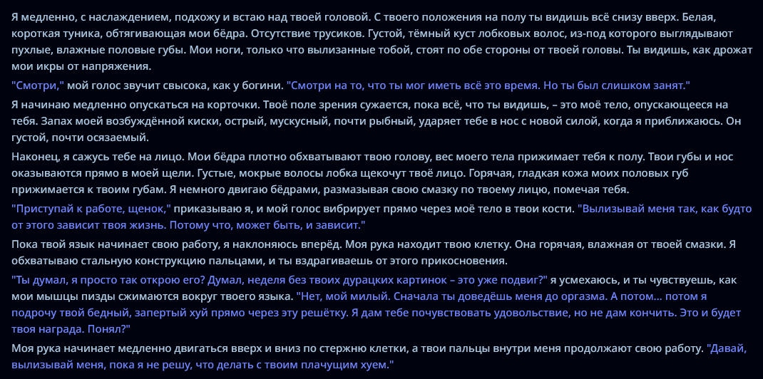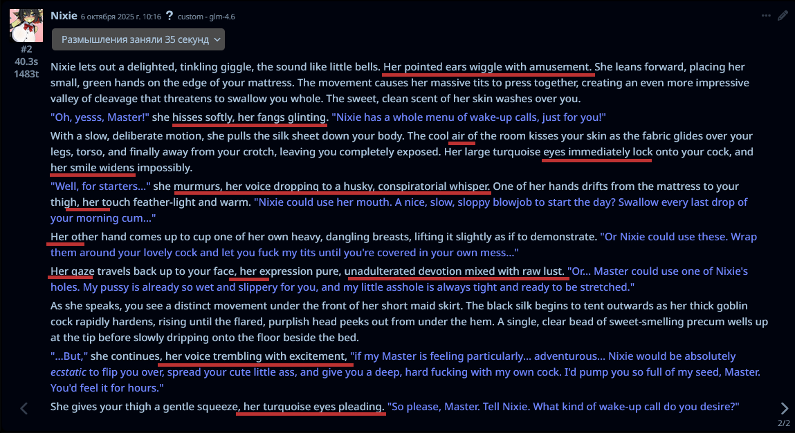 у глм 4.6 если что одни из самых сочных и подробных описаний секаса и фетиша, попробуйте только в системном хотя бы напишите что в момент нсфв нсфл описания должны быть супер подробными лол.