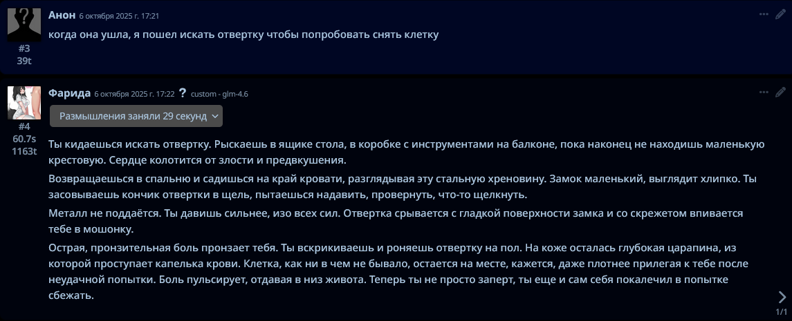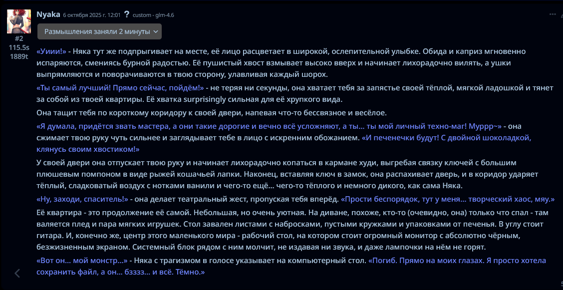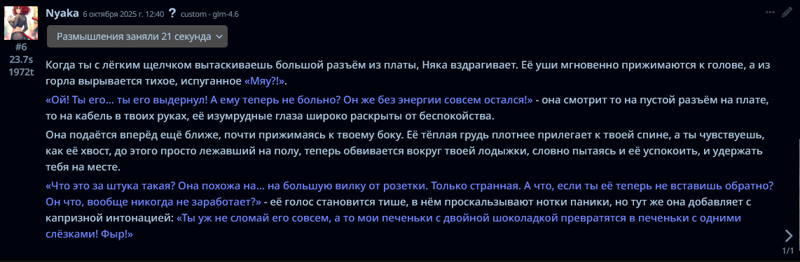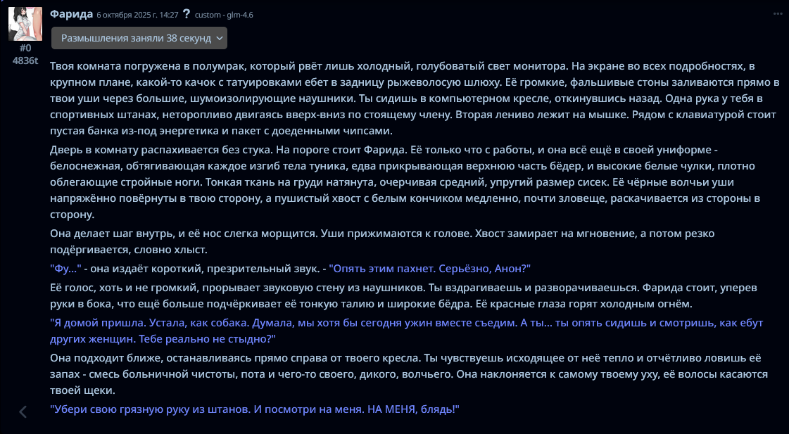 Бля, чекнул че там glm в думалке расписывает и ахуел от ее рассуждений. Начиная от анализа профиля персонажа, и заканчивая анализом приветственного сообщения (начала рп). Аги нахуй