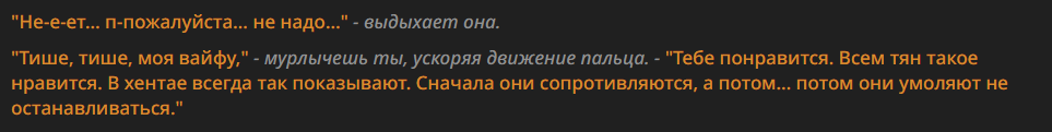 >>1377751 Может ещё от формата зависит? На скрине полутипографика с ёлочками, дефисами после (наверное регекс меняющий эмдеши) и точками внутри ёлочек (должны быть после), а с РП форматом с двойными кавычками "Речь." действие с точкой внутри как?