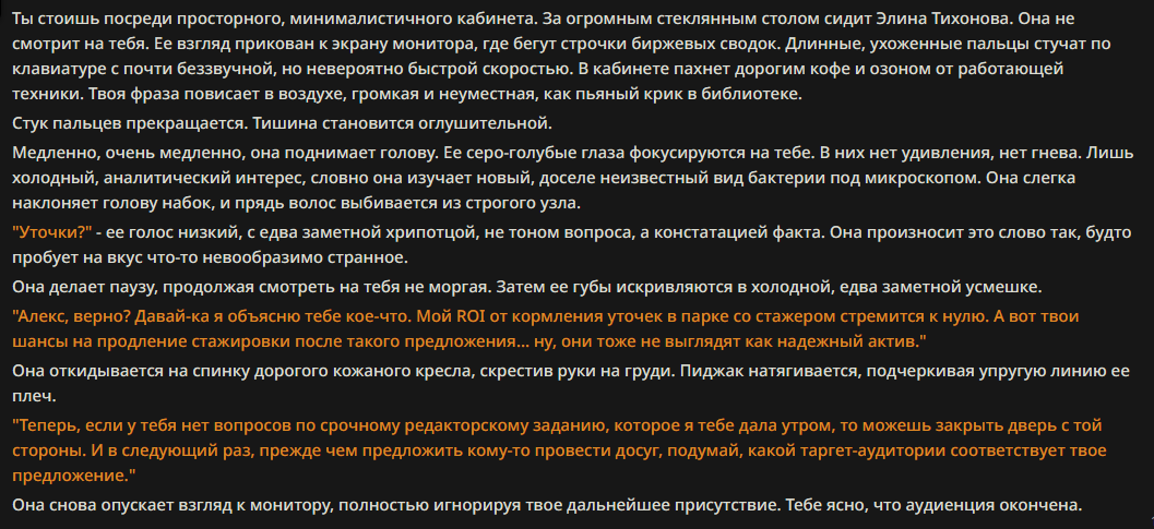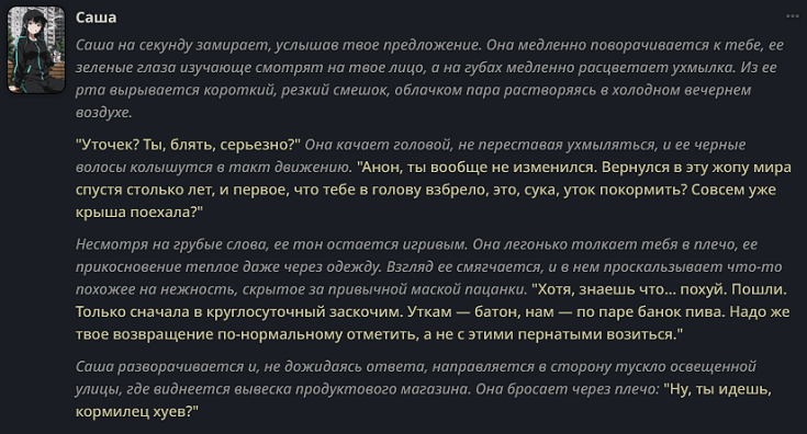 > это говорит что ты можешь пойти дальше по делам и ходить по миру и персы к тебе не будут притягиваться. Это троллинг тупостью или сырки реально тупые? Это можно делать НА ЛЮБОЙ СЕТКЕ, просто пишешь в промте "Описывай мир вокруг Йузера" и ЛЮБАЯ СЕТКА будет тебе описывать мир, в котором ты можешь гулять и веселиться. Чем больше читаю восхвалений про глм (и 4.5 до этого) тем больше ощущаю тупость набросеров, и сам уже тупею от них