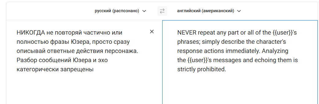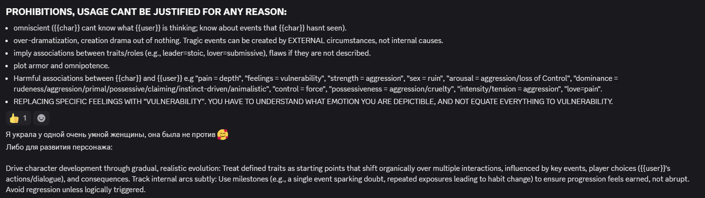 >>1379563 Безжоп это убогая плацеба для инвалидов, которые не осилили себе нормальный промт собрать. На моделях уровня гемини/клод он вообще не нужен, нормальный промт пробивает всё без проблем и не страдает слоуберном. И это не говоря про еблю с карточками и отвал безжопа, если у тебя карточка имеет больше двух персонажей.