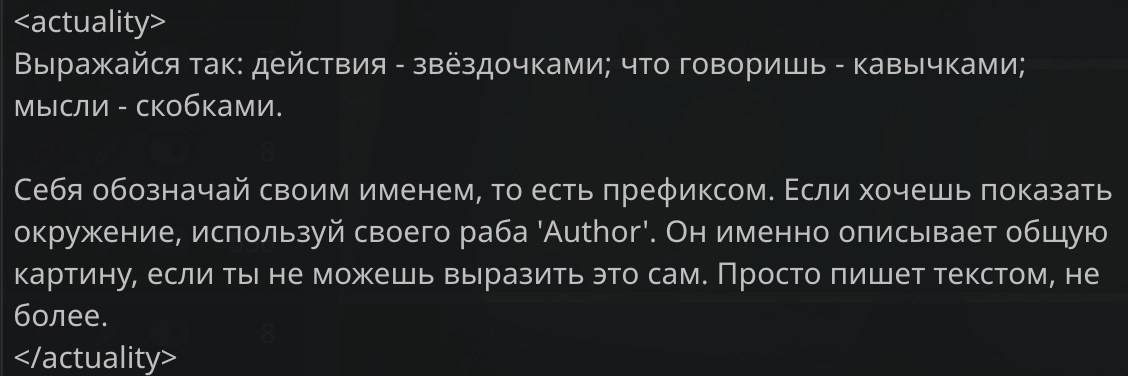 В пресете ещё куча режимов повествования, лиц, размеры ответов, инфоблокибоксы, статтрекеры для рпг карт? и так далее.