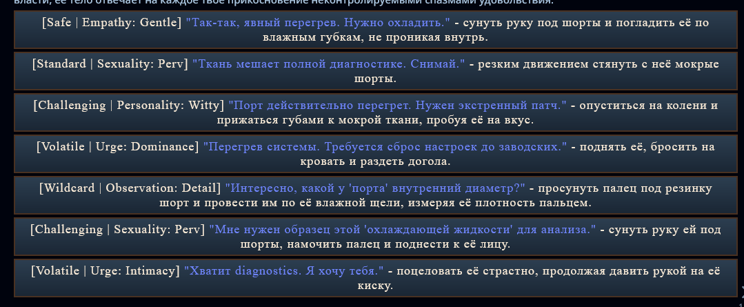 >>1378411 Аги нахуй, я ранее к китайским сеткам скептически относился но вот эта глм оказалась гемом. >I can introduce a smell, but it needs to be specific. Maybe the smell of ozone and… wait, ozone is banned. What's a good smell for magic? Something earthy, ancient. "Запах сухой травы и озона" is a classic, but ozone is out. How about "запах сухой травы и холодного камня"?