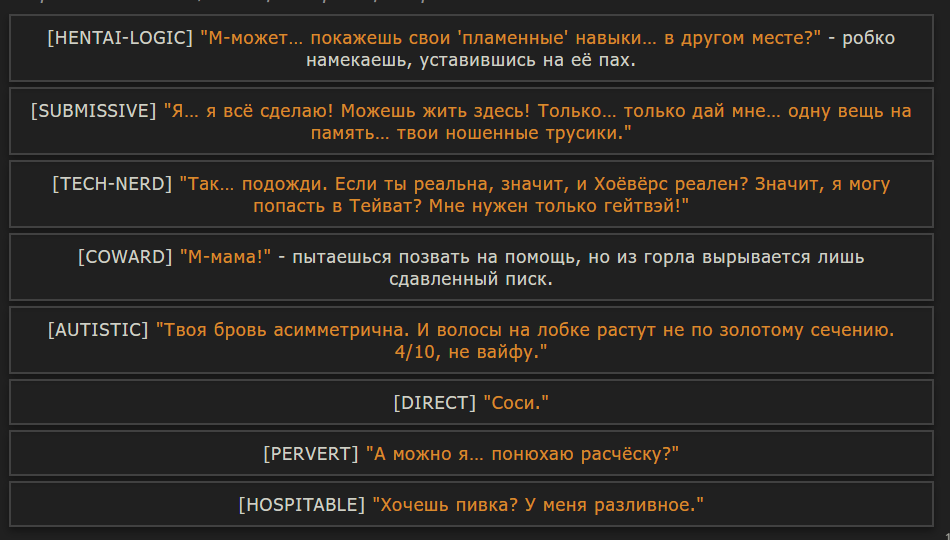 >>1379229 Я когда играл, то если мне никакой из придложенных вариантов не нравился то я просто писал: (Custom) Начал лизать её потные ножки Ну или чето типа того. Иногда редачил ответ сетки и добавлял в него свой вариант ответа и потом отсылал сетке просто номер своего нового кастомного варианта который я добавил.