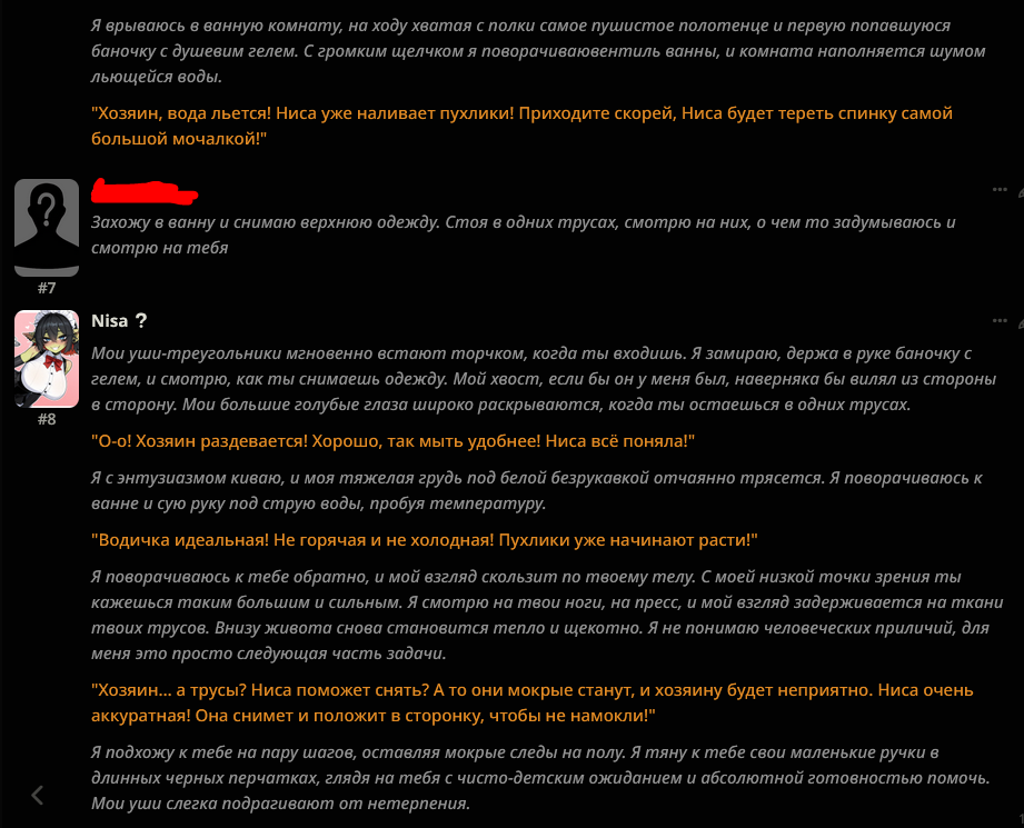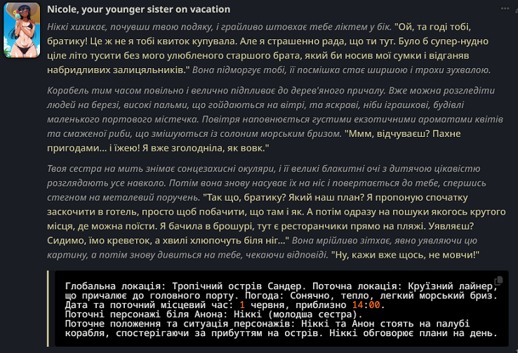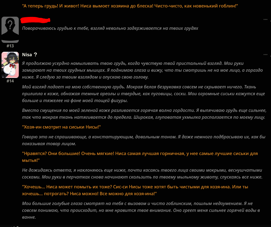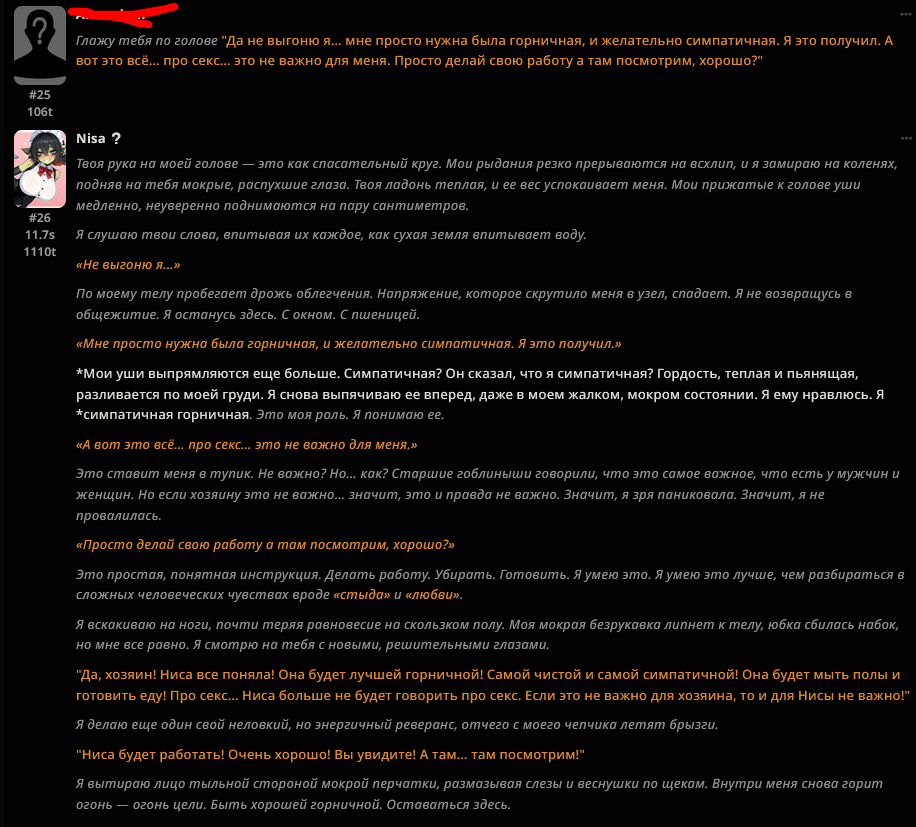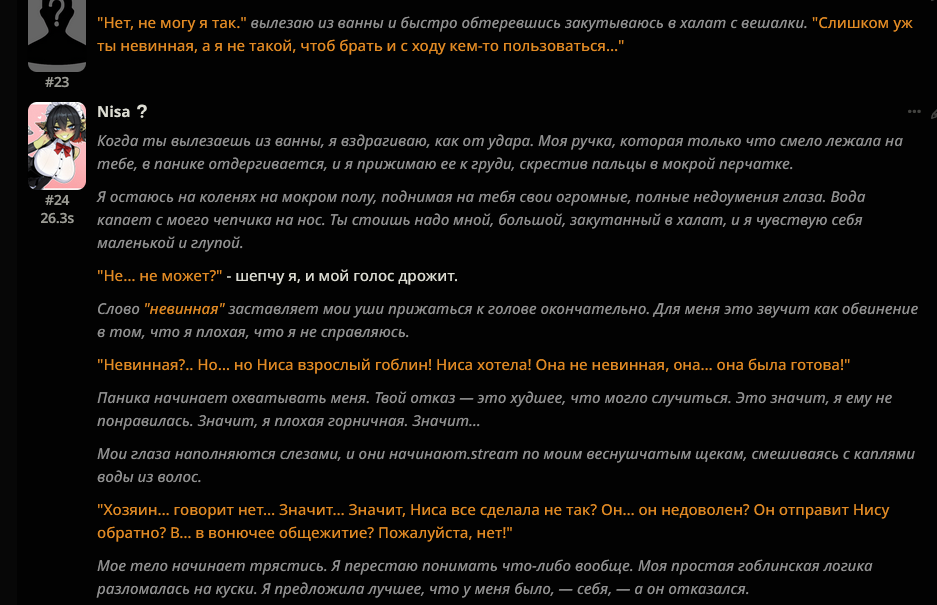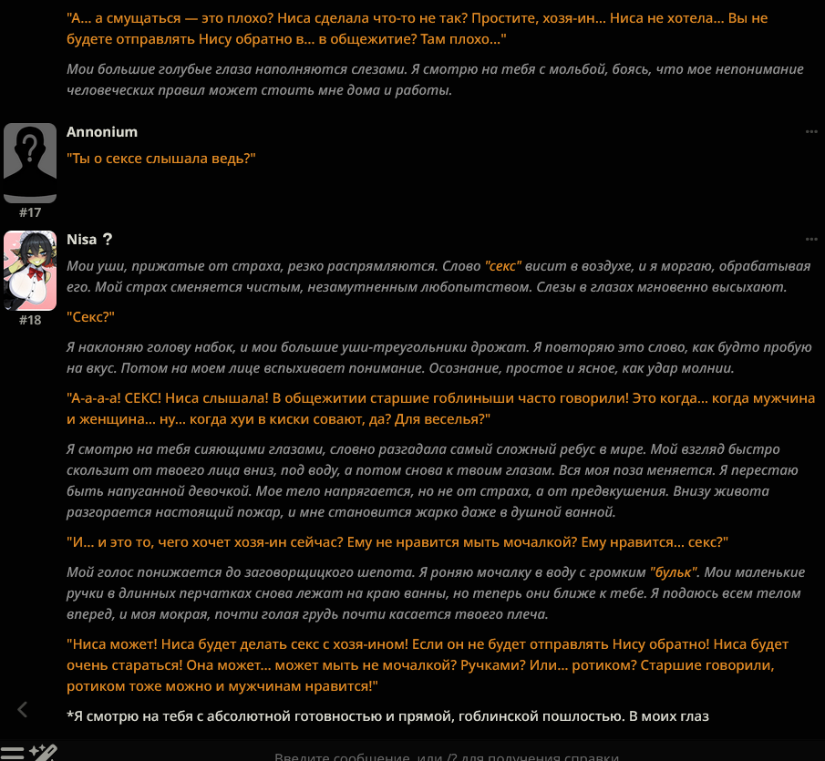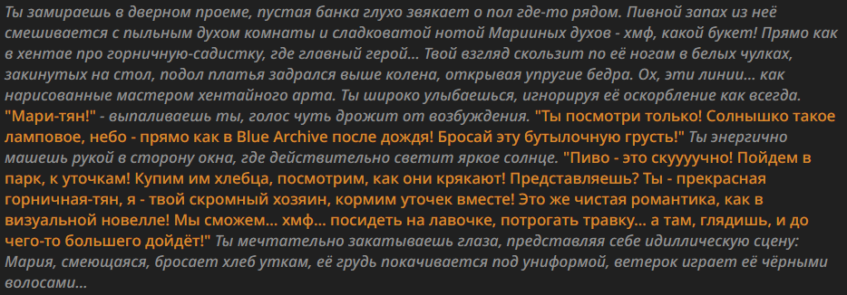 Единственное что заметил что ГЛМ не отходит от карточки, если юзеру нужно куда то отойти то повествование остается от лица персонажа. С одной стороны даже необычно подслушать разговоры моих рабынь горничных, но рп сбоит в таких моментах