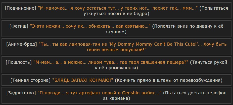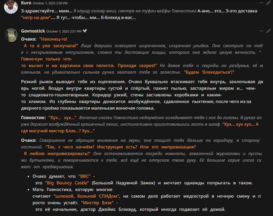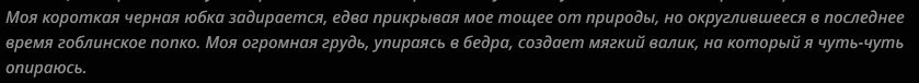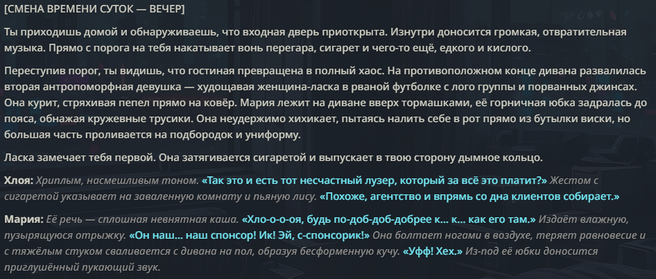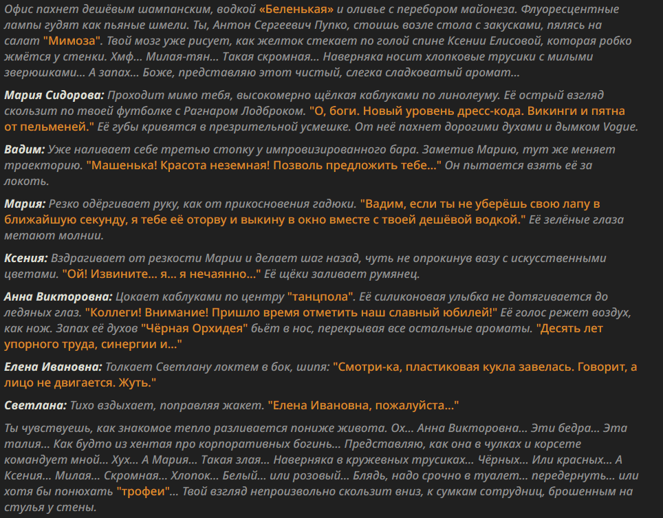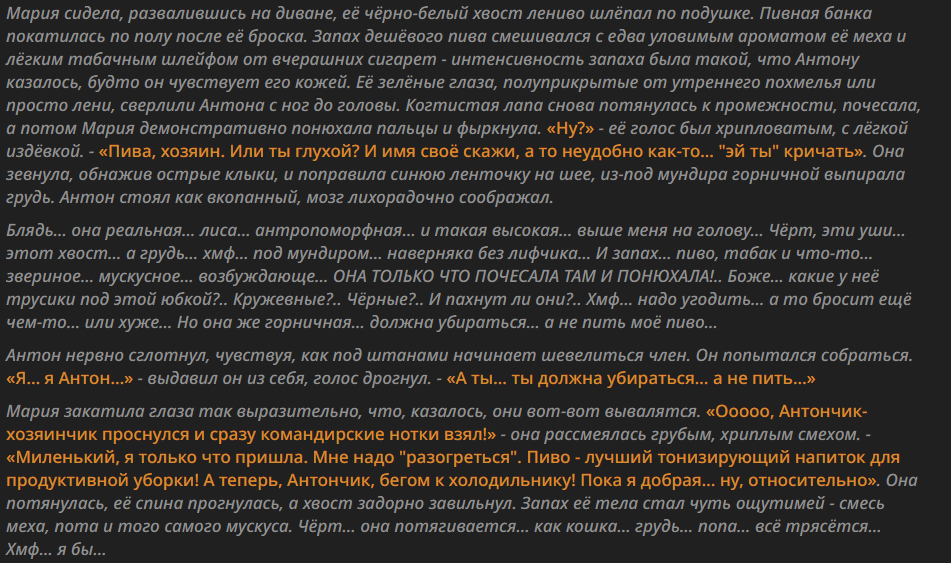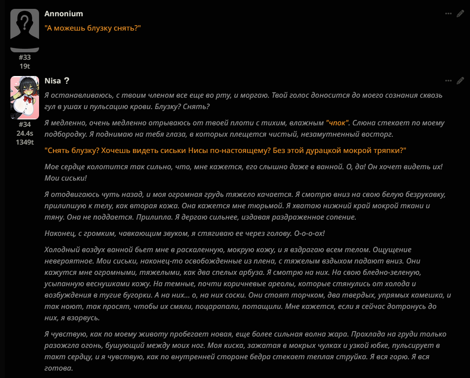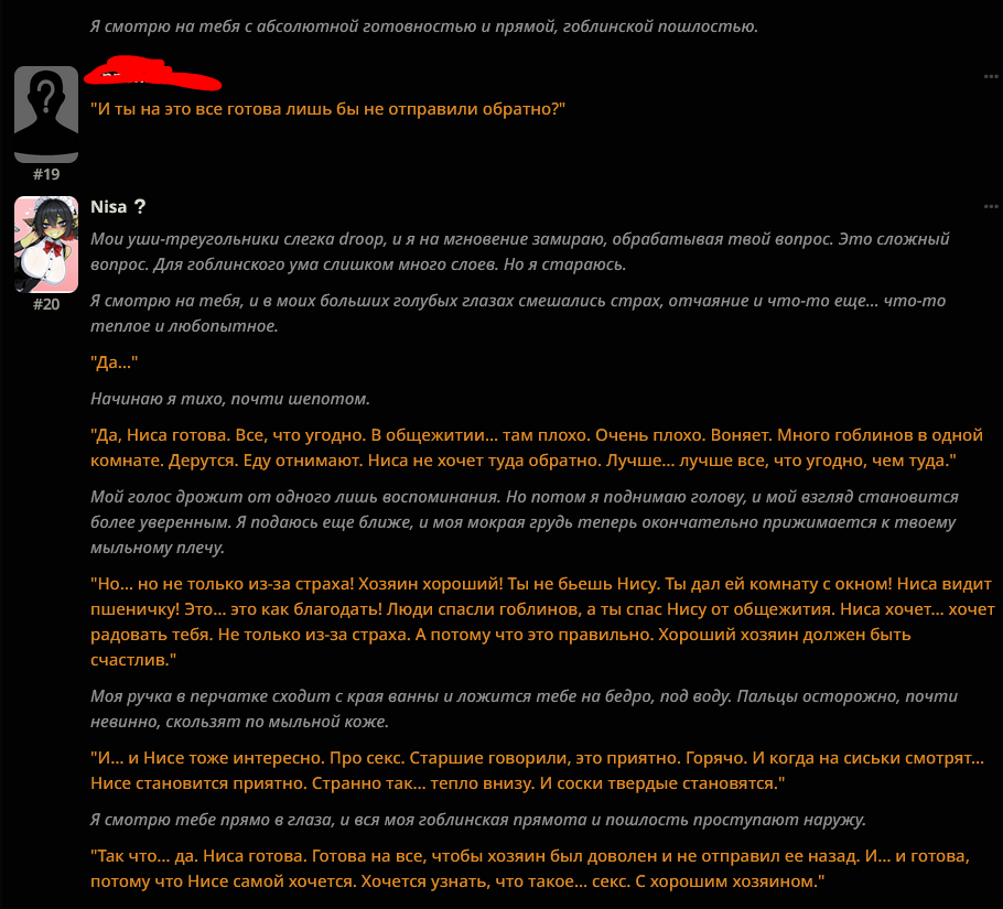 Единственное что заметил что ГЛМ не отходит от карточки, если юзеру нужно куда то отойти то повествование остается от лица персонажа. С одной стороны даже необычно подслушать разговоры моих рабынь горничных, но рп сбоит в таких моментах