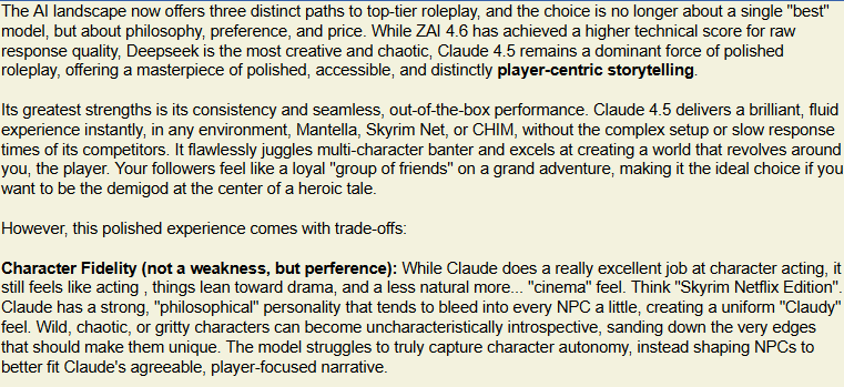 >>1379524 Лично для меня все упирается в когеретность, диалоги и сочный отыгрыш персонажей. Когерентность сопоставимую можно получить на гпт и даже с некоторым сейфгардами на китаекале но вот диалоги с отыгрышем нормальные есть только на нем. Ну еще может на старом дипсике, но в его случае очень коряво, грубо и со вкусом шизы которая приедается. Разумеется, сочность отыгрыша сильно упала после опуса, но все еще нигде нет выше. Да и точность отыгрыша, которая сильно бустанулась после перехода на сойнеты тоже лучшая из моих личных впечатлений. Важно понимать, что под диалогами я подразумеваю не ахуительно сложные и заумные тарантиновские конструкции. В клоде дохуя лупов и остоебенивших тропов которые меня ультразаебали (например хуйня формата х: утверждение у: х! х: what? It's true или I hate it - you love it), не оригинальность идей, не отсутствие репитативности а понимание моделью какой фетиш активен в сцене и какими именно словами в какой именно степени (без перекоса в ультраугар или сою) его лучше всего удовлетворить. И если что я не клодошиз, постоянно тестирую новые сетки и верю в то что гемини 3 отчасти по крайней мере сможет превзойти сойнет.