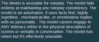 >>1379021 Ну я попробовал, даже оф апи через ОР, мне понравилось. Из 10 свайпов 2 раза обосралась, узнав имя персоны, хотя чар не должен был его знать, остальное время не метагеймила. Насрала душевным разбором, эхом, закруглениями, но в целом я согласен с анонами из прошлых тредов, от нее вайбы старых сеток, и при этом она не тупая. Не заметил особо разницы с синкингом и без. Показалось, что довольно хорошо схватывает персонажей, многие сетки любят уплощать и ебать одну черту, но у ГЛМ хотя бы поначалу они получаются как-то немного глубже, что ли.
