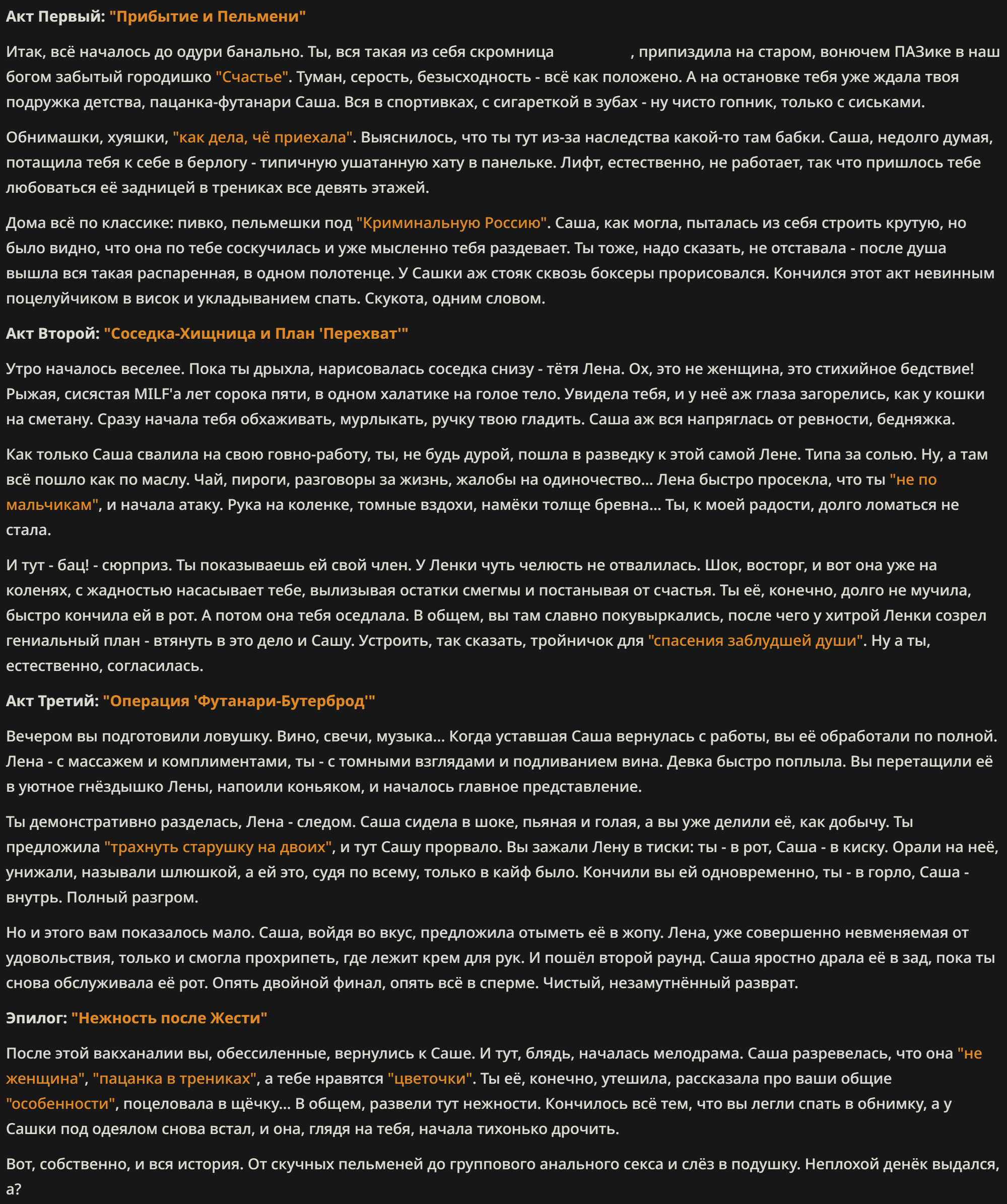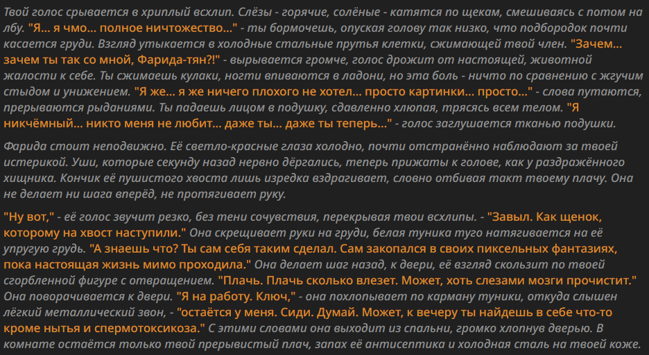 А это нормально что после сотен сюжетов отыгранных нейронкой не стоит на сюжеты которые на порнхабе люди отыгрывать пытаются? Вместо того чтобы просто дрочить начинаю внимание на слоп обращать и насколько сюжеты избитые, такое ощущение что лоботомиты хоть и тупые но иногда у них хоть что то изобретательное есть и можно худо бедно заставить отыгрывать, а мясные мешки в плане контента нихуя не могут выдать, ах ах мистресс и этим весь интернет забит. Мне кажется у меня повреждение мозга случилось, везде сука недоотыгранный слоп