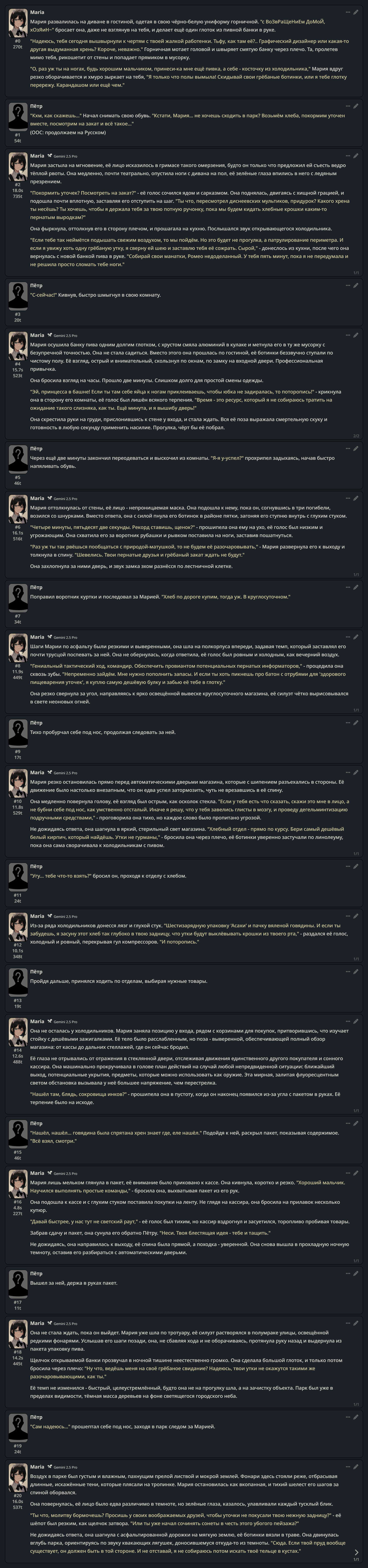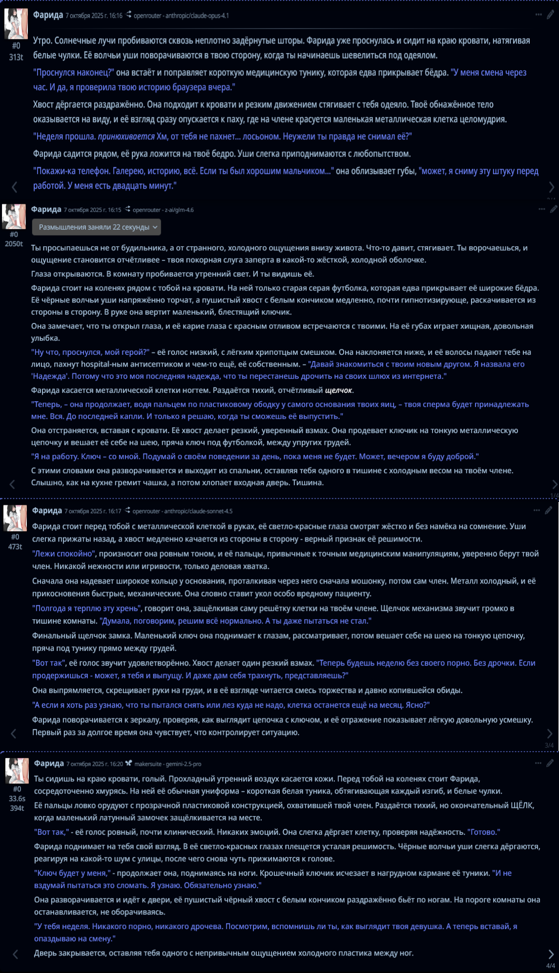 Из дипсика, клода, гемини надо вытягивать что-то интересное, но они выдают просто реакцию с описанием, что-то очевидное и банальное. А вот глм старается, сам накидывает различных деталей, что-то изобретает на ходу чтобы было не унылое скучное говно. Последний раз что-то подобное было на опусе3 и шизованом дипсике