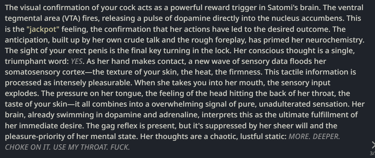 неиронично глм 4.6 щас кажется самой кумной сеткой, даже лучше опуса 3, там мало того что псков, так еще очень подробно и поэтапно описывается пиздец, причем подробно не типо анатомическая научная хуйня, а в вульгарном плане, очень подробно но когда читаешь всё понятно, охуеть. попробуйте послоубернить на ней нсфв или горе
