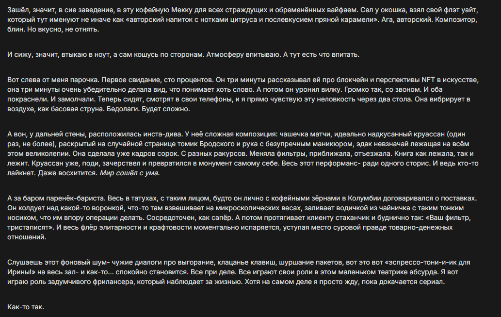 >>1378501 Русская типографика из-за точек после кавычек. На начитанном Клоде подтянулся книжный датасет с красивыми, литературными диалогами, когда как на других сетках подтянулось бульварное чтиво с графоманией.