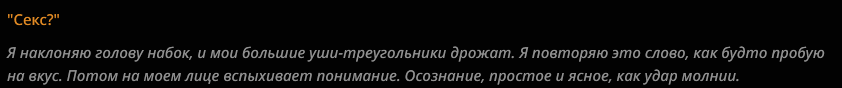 Это образное, интуитивное, физическое событие. Можно почти физически ощутить внезапную тишину в комнате, как будто весь озон действительно был высасыван из лёгких Элары. Сам воздух становится разреженным перед лицом такого откровения.