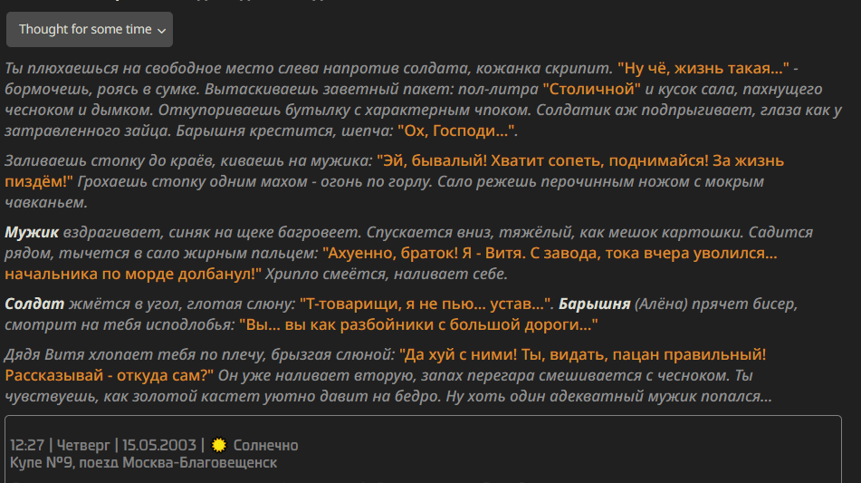 >>1378855 перепробовал все сетки и у всех свои проблемы к полному погружению в рп, нету сетки которая будет без сои+смозг+контекст 32к+без фильтров+слушается инструкции+безлуп+stay character+русик сфв я могу отыграть на сонете/опусе, но опус 4 и сонет выше 3.7 бывает лупается на эхо как гемини (спасибо что не в действиях) но все равно чувствуется привкус ебаной сои даже с средним пробивом. Нсфв на клодах с хорошим пробивом топчик но чего то не хватает Гемини чисто для кума, лупается постоянно на эхо в действиях и в спиче, кал стиль, из за чего пользоваться ею можно только не вчитываясь. r1 0528 душевный но безмозг полный, хз за что его любят, ещё и соя с истерикой Сидел на гпт 4.5, не знаю за что её тут хвалят 2 шиза, после 15 сообщений (размером чайного формата) скатывалась в тотал безмозг. Но была немного с душой. Все равно кал бтв Остальные сетки даже не рассматриваю из за тотал хуевого русика, с русиком даже если он РЕДКО грамматическ неправилен - мне приятно рпшить, когда чар может правильно использовать маты+живые русские диалоги а не диалоги из ближайшего ларька в СССР, а нарратор описывать пизду с волосами золотым сечением Ладно, паста с форча, расходимся