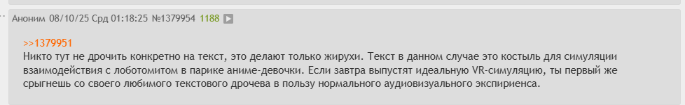 >>1379951 Никто тут не дрочить конкретно на текст, это делают только жирухи. Текст в данном случае это костыль для симуляции взаимодействия с лоботомитом в парике аниме-девочки. Если завтра выпустят идеальную VR-симуляцию, ты первый же срыгнешь со своего любимого текстового дрочева в пользу нормального аудиовизуального экспириенса.