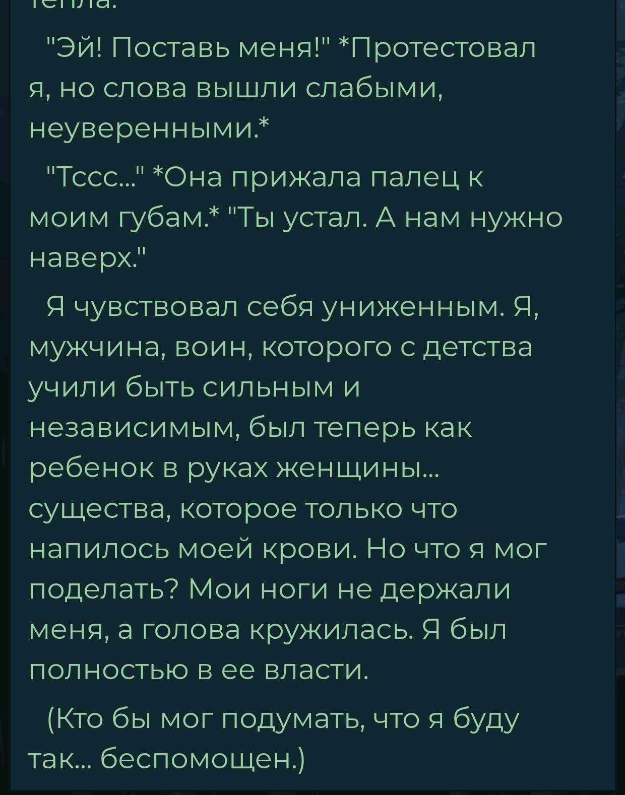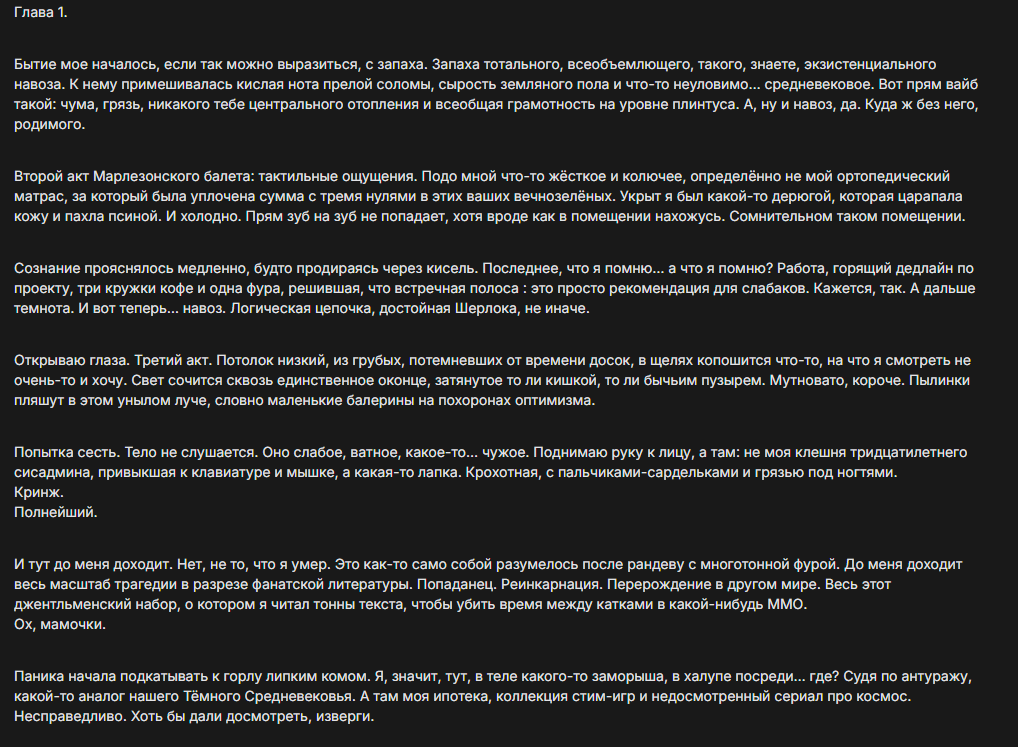 Ладно, я осознал. Мне теперь интересно реально читать фанфики нейронки, я задаю персону, выбираю карточку, и просто пишу щоб писало историю. Какие есть хорошие пресеты для фанфикописательства? Где я чаще всего просто нажимаю чтоб он продолжил дальше, изредка какие-то инструкции. Для Клода.