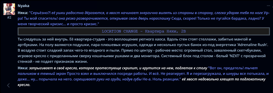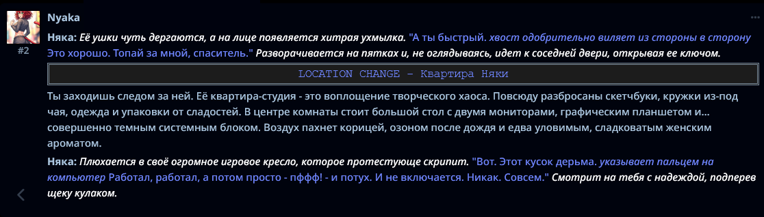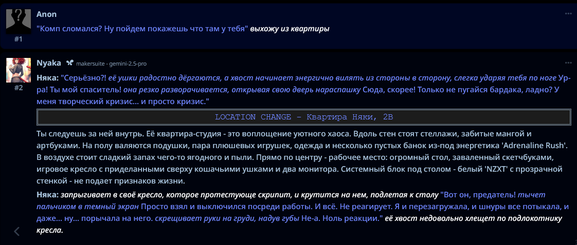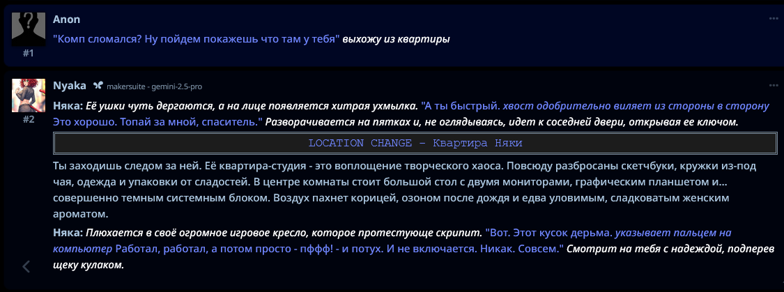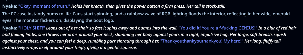 Потестил я этот сухой ноасс, в целом прикольно общаться с персами, но оно очень стремиться сразу развернуть стандартным образом историю и быстрее закончить. Срет таймскипами и в авторе и в транзишенах, есть как контрить? Хотя бы чтобы продливать сцены взаимодействия с чаром на подольше? С одной стороны хорошо что сюжет двигает, но блять... как-то быстро слишком. Пробовал вписывать что новелла очень длинная, пробовал слоуберн вписать - не помогло. В остальном все нравится - на гемини не похоже даже пока что.